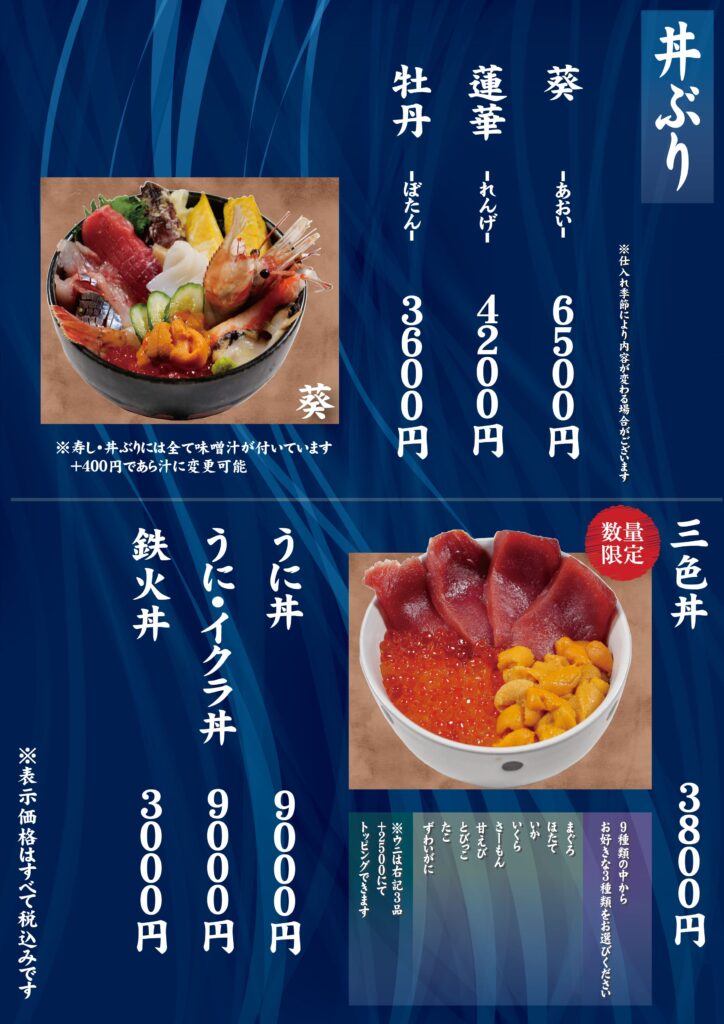 マグロ・ホタテ・イカ・甘エビ・タコ・イクラ・サーモン・カニ・トビッコの中から、3種類選べる海鮮丼。はみ出すほど大きなネタが視覚も刺激。自身でカスタマイズする楽しさも五感も満たしてくれる一品です。